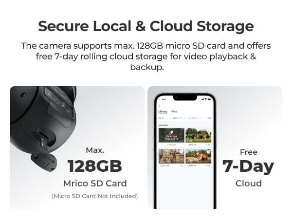 This security camera records motion-triggered events for later playback. You can save them locally on a microSD card (up to 128 GB) or images can be uploaded and stored on the Reolink encrypted cloud storage